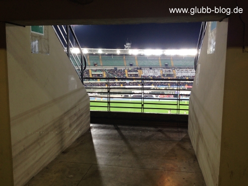 Der reine Fahrtweg wurde laut Navi mit 23 km ohne die anfallenden Autostrada-Gebühren angezeigt. “Lass uns um 19:00 Uhr losfahren, da können wir noch schön gemütlich das eine oder andere Bierchen zischen … Wir sind ja in ner halben Stunde dort.”Ja Pustekuchen! Auf der anscheinend sehr beliebten Einfallstrasse nach Verona war am Sonntag Abend mehr Verkehr als am Plärrer um 17:00 werktags. Zähflüssig ging es bis zum Stadion durch die Stadt, doch wir freuten uns dafür umso mehr als wir ankamen. Wie früher der Gladbacher Bökelberg liegt das Stadio Marc’Antonio mitten in der Stadt, zwischen Wohnhäusern und Einkaufsläden. Genauso nah lag dann auch der Parkplatz (5 Minuten weg), welcher folgend noch eine Rolle spielen sollte.